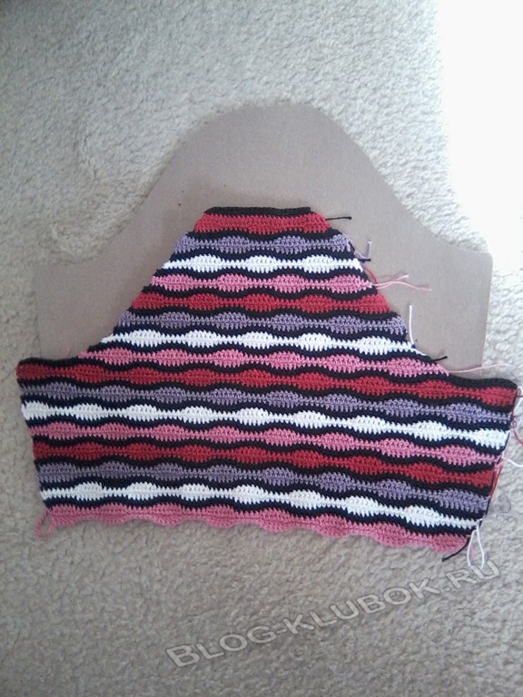 Хвостики ниток плотно завязала, отрезала, если где было больше 2см, и швейными нитками в тон основному полотну швом «через край» аккуратно пришила по краю самого изделия. Я уже заранее решила, как буду прятать край изделия. Так много неровностей! Так много было цветных «хвостиков» ниток! Набираю белой нитью цепочку из ВП, с запасом, и начинаю провязывать СБН. Английскими иголками прикалываю эту «ленточку» по краю горловины, определяюсь с длиной. Длину узнала! Разворачиваю вязание и продолжаю вязать только арки из 3 ВП, вводя крючок, соединяя при этом новую арочку, через 1 петлю на моей «ленточке». Нитки толстоваты, чтобы что-либо еще вывязывать. Заправляю концы нитки, и швейной нитью швом «назад иголка» прикеттлёвываю свою «ленточку» по краю горловины, закрывая таким образом все неровности от убавок.
